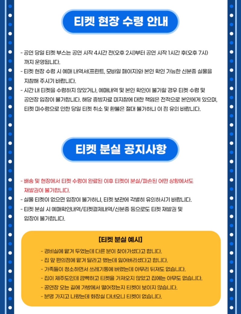 예매 전에 꼼꼼히 읽어 보시고 준비하셔서 즐거운 공연 되시길 바랍니다!~