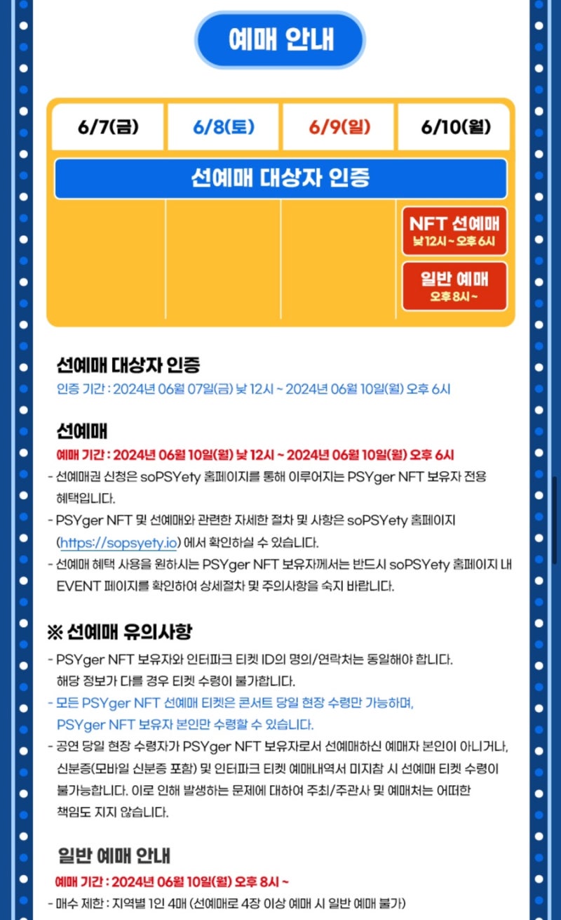 6월 10일 (월) 점심 12시부터 저녁 6시 사이에 가능한데요. 선예매에 참가하려면 PSYger NFT가 필수로 있어야 합니다. 직접 자세한 내용 확인해보고 싶은 분들은 아래 soPSYety 사이트에서 확인해주세요