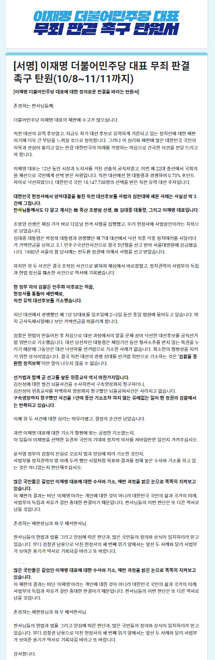 이재명 대표 지지자들의 탄원 내용은 주로 다음과 같은 주장을 담고 있습니다.