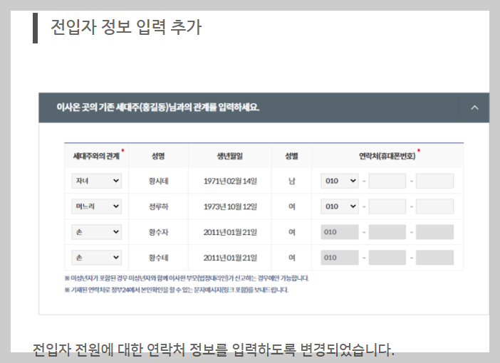4. 구성원이 여러명인 경우 위와 같이 전입자 전원에 대한 연락처를 기록하게 되어있습니다.