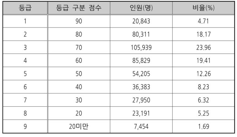 각 등급의 인원과 비율(%)이 기재되어 있습니다