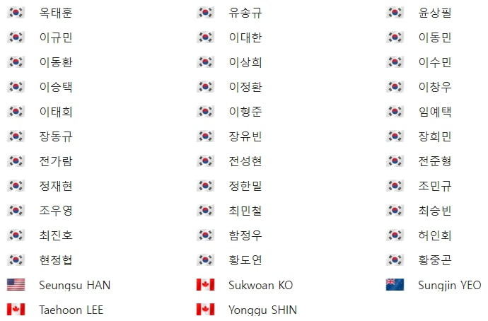 이상희, 이정환, 이형준, 장유빈, 전성현, 정한밀, 최민철, 함정우, 황도연, 황중곤, 이동민