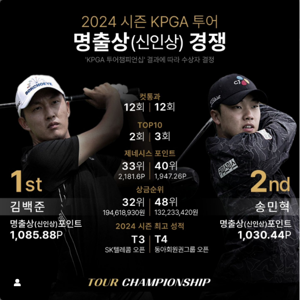 2024 시즌의 마지막을 장식하는 ‘KPGA 투어챔피언십’은 7일부터 10일까지 제주 표선의 사이프러스 골프 앤 리조트에서 열린다. 이번 대회는 72홀 스트로크 플레이 방식으로 진행되며, 모든 선수가 컷오프 없이 4라운드를 소화한다. 우승자는 2년간 투어 시드와 1,000 제네시스 포인트를 획득하며, 총상금은 11억 원이다.