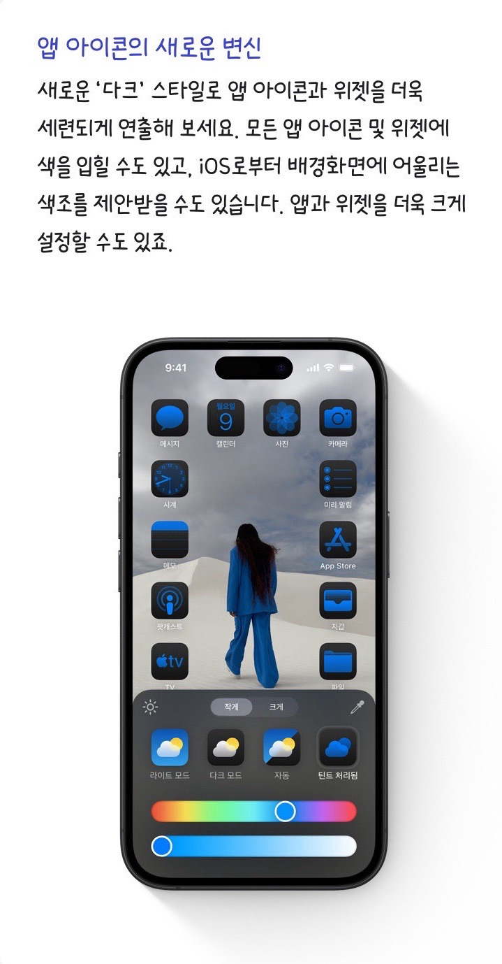 홈 화면 레이아웃부터 앱 아이콘 스타일 변경, 앱 가리기 등이 가능하며, 다크 스타일을 앱 아이콘과 위젯 등에 적용할 수 있는데요.