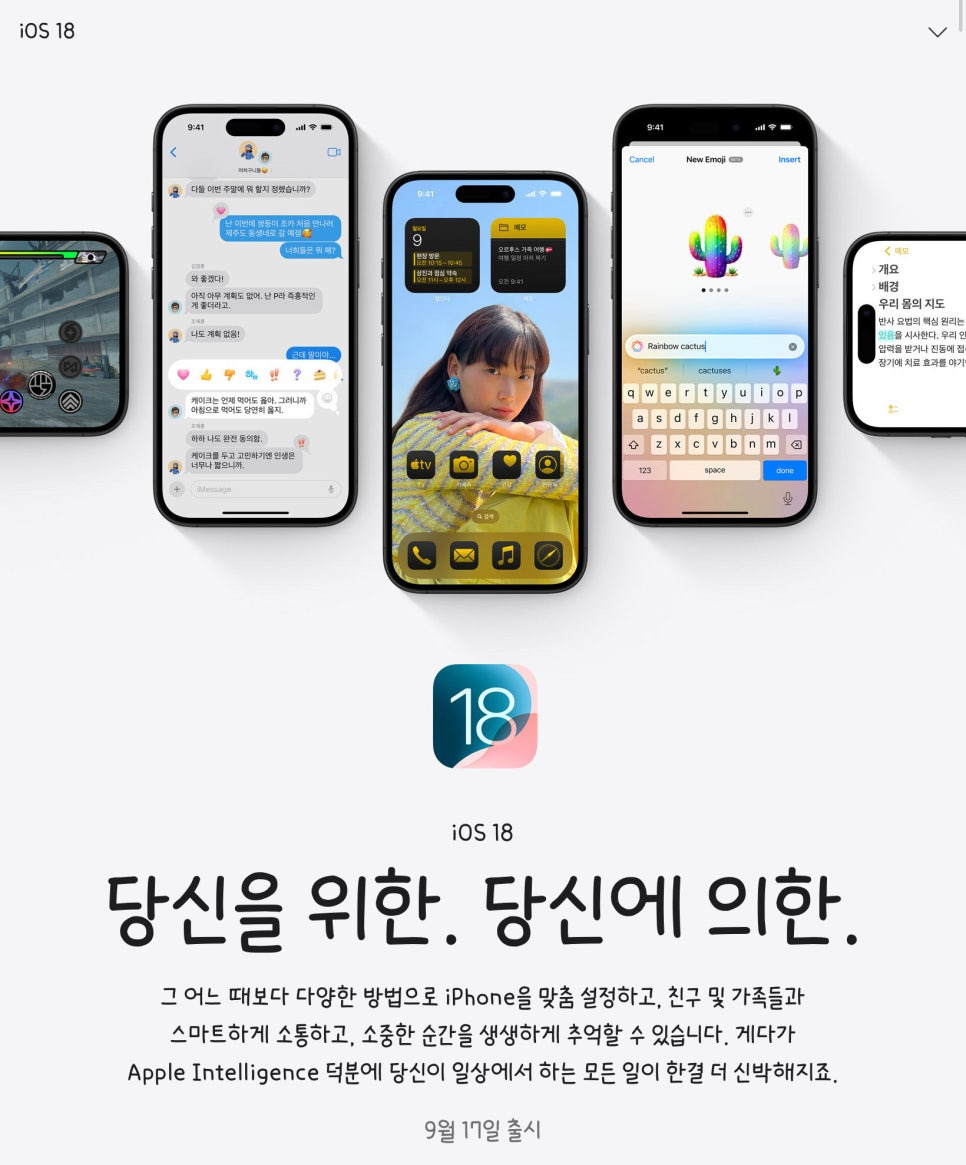 출시된 지 시간이 꽤 흐른 디바이스도 이번 버전을 적용할 수 있습니다. 향후 Apple Intelligence의 경우에는 아이폰 15 PRO 이상부터 제공되지만 말이죠. 최근 출시된 아이폰 15 시리즈는 물론이고, iPhone SE까지 제공하는 등 굉장히 넓은 호환 범위를 보여주고 있는데요. 지원 기기 리스트는 위 이미지를 확인해 주시기 바랍니다.