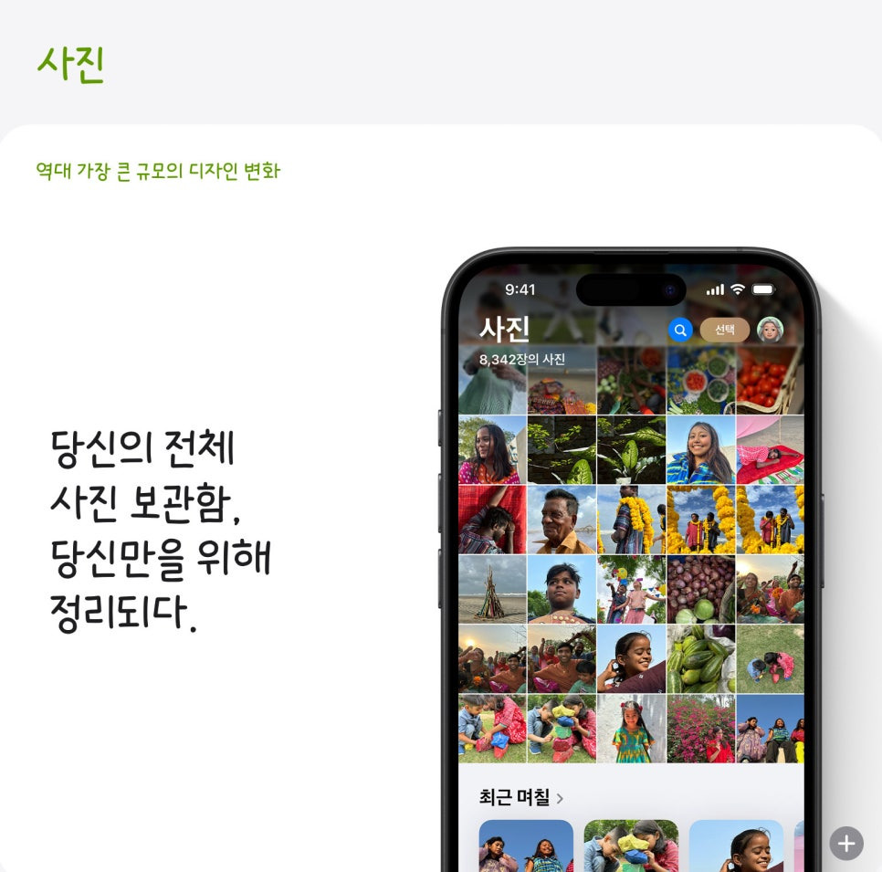 역대 가장 큰 규모로 사진 앱 디자인이 변경되었습니다. 개인화된 데이터를 통해 사진 앱에서 더 쉬운 서칭과 정리 그리고 추억을 확인할 수 있습니다. 모음 기능이 제공되며, 최근에 찍은 사진, 특정된 사람 또는 반려동물, 테마 (여행 등)를 기반으로 사진을 모아 보여주기 때문입니다.