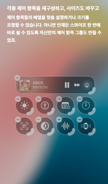 또한 제어센터에 사용되는 항목 재설정과 사이즈 변경, 잠금 화면에서 사용할 수 있는 손전등과 카메라 제어센터 기능을 커스텀 해 다른 기능으로 바꿀 수 있습니다. 예를 들면 음성 메모를 잠금 화면 제어센터 버튼에 할당해 화면을 열지 않아도 즉시 현장 상황을 녹음하거나, 타이머 설정, 알림 등을 지정할 수 있습니다.